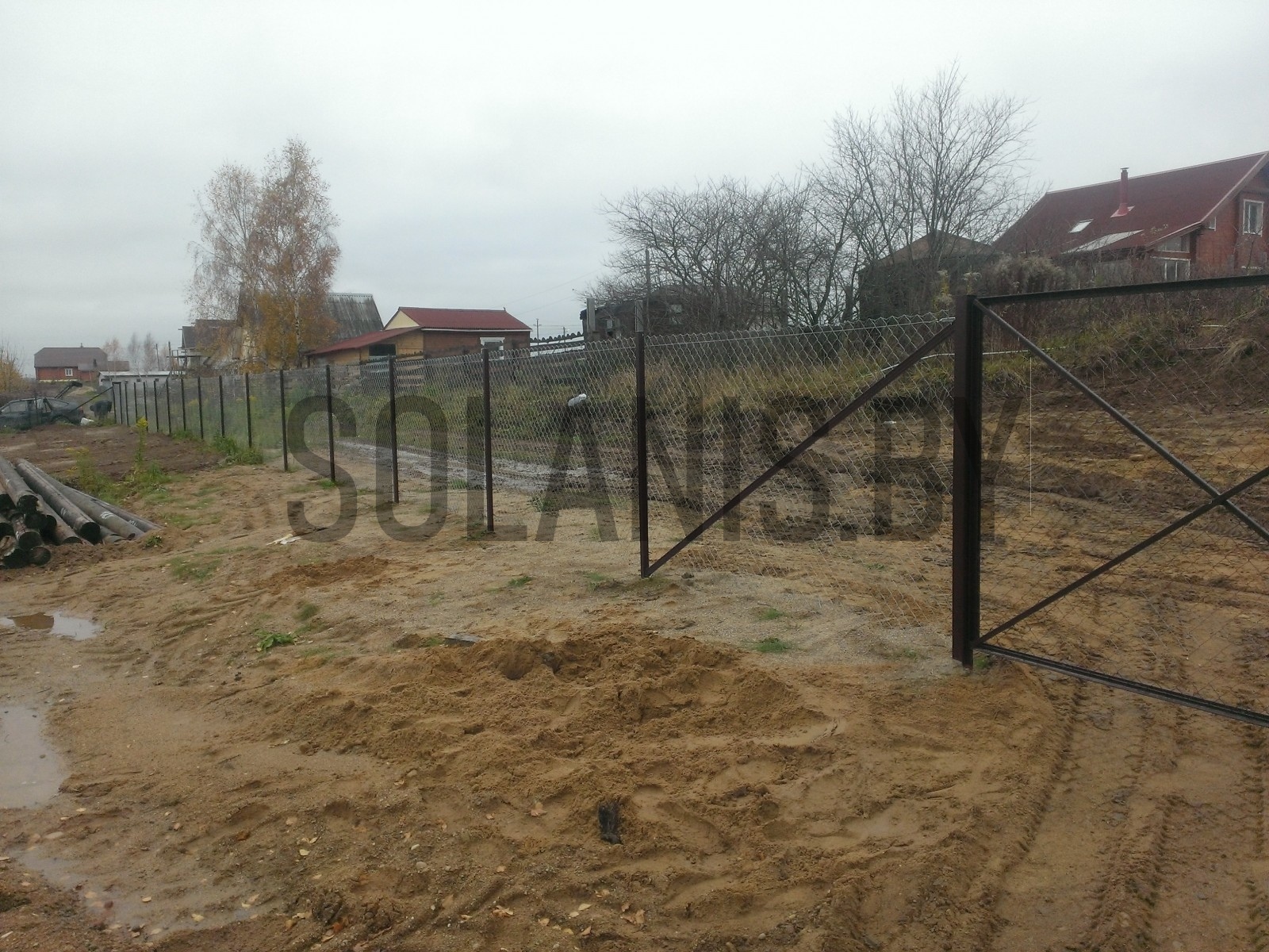 Входит в соимость: столбы 60х40, загрунтованные грунтовкой ГФ-021, заглушеные, бетонируются в землю на 0,8-0,9 метра на расстоянии 2.5 метра, сетка рабица оцинкованная ячейка 50х50 , толщина проволоки 1.8 мм, сверху натягивается оцинкованная проволока 2,5мм на талрепы, на углы и крайние столбы навариваются распорки из трубы 40х20.